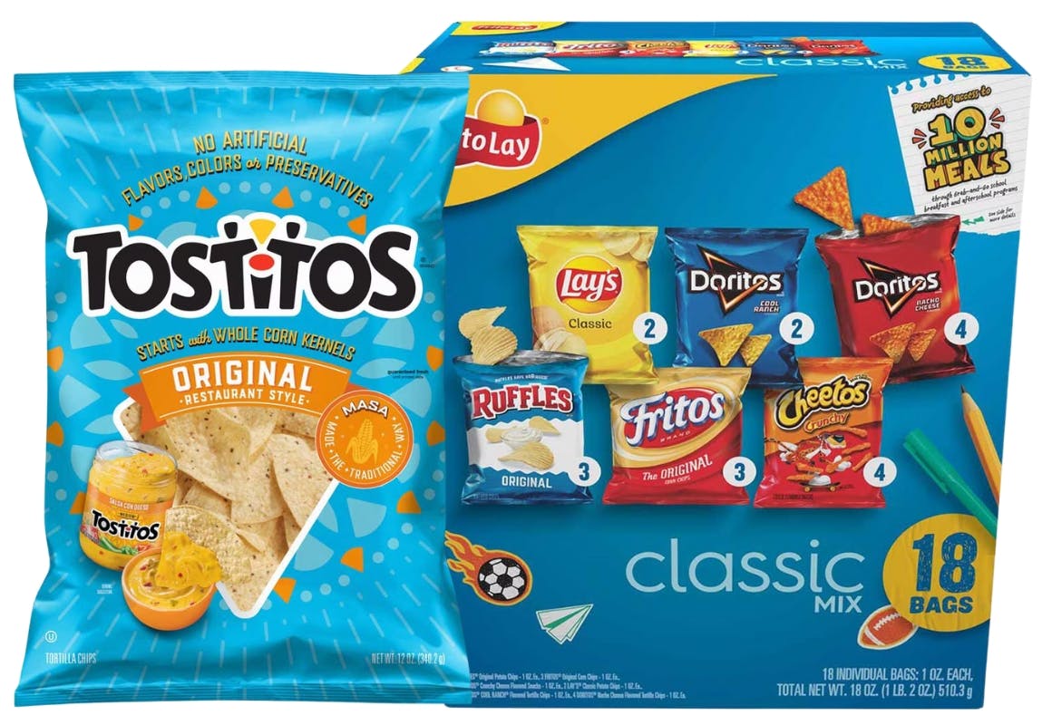 Dollar General is offering a great deal on snacks this week — no coupons needed. Purchase two bags of Tostitos tortilla chips (or Tostitos dips or Cheetos, if you'd prefer) and you'll get a free 18-count Frito-Lay chips variety pack.