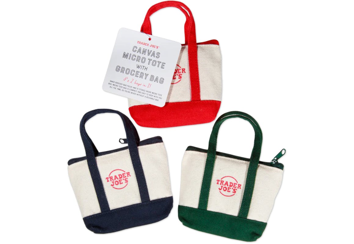 Pick up new Trader Joe's canvas micro totes for just $2.99 in stores while supplies last. These little totes have a reusable grocery bag tucked inside and are likely to sell out quickly.