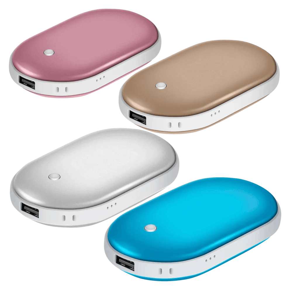 The hand warmer charger is available in rose gold, gold, silver, and blue colors. It has three temperature levels that heat on both sides.