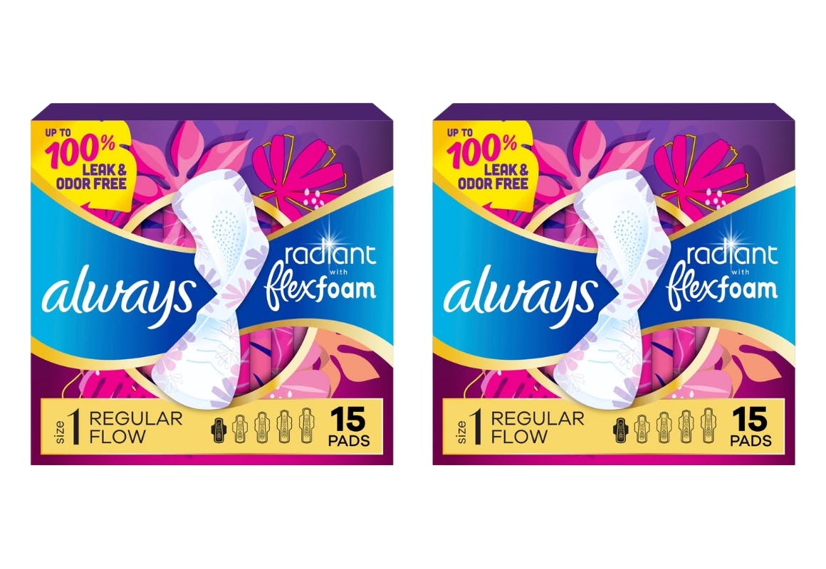 Grab two 15-count packs of Always Radiant FlexFoam Pads at Walmart for $9.94, or pay just $6.94 after a $3 Walmart Cash rebate. That breaks down to only $3.47 per pack — you can stock up for an affordable price.