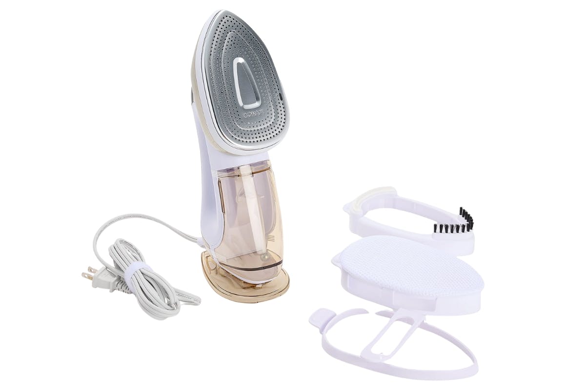 This steamer iron includes a delicates bonnet, a creaser, a silicone band, and a bristle brush. It has four steam settings, a steam sensor, and LED touch controls. The water tank holds 8.5 ounces, and it heats up in about 10 seconds.