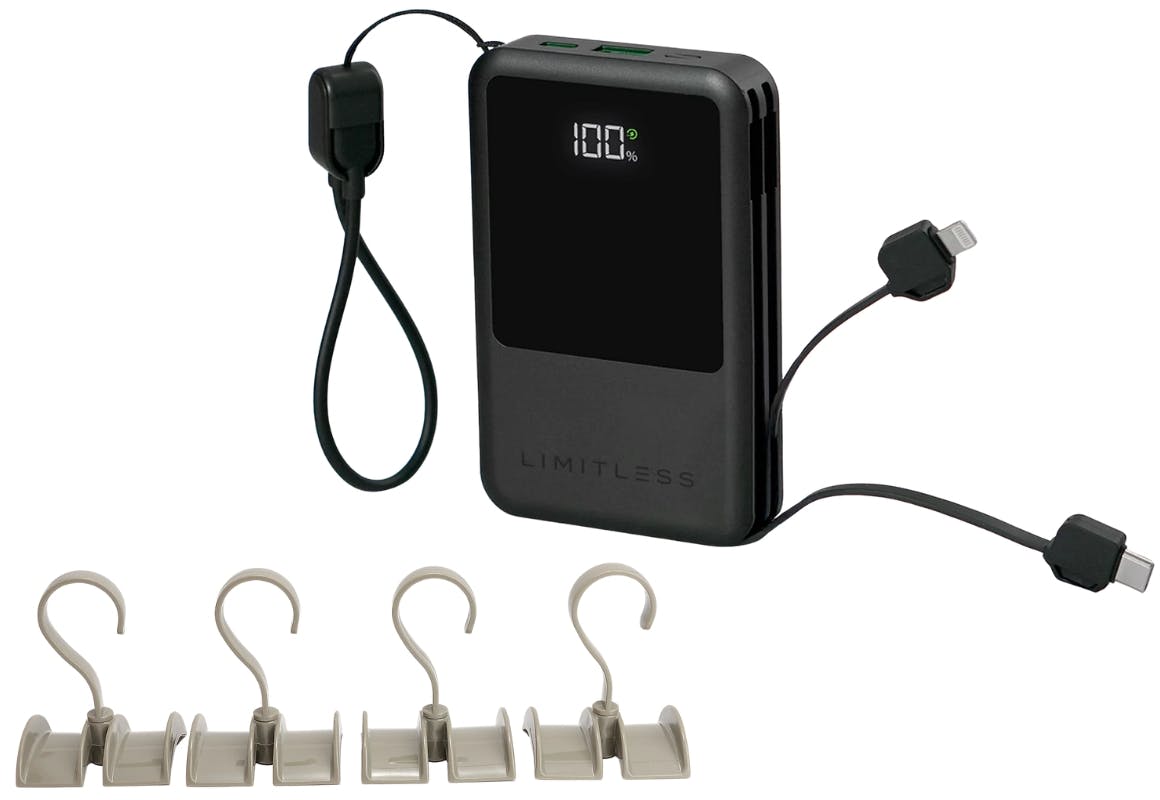 The Limitless power bank is listed at QVC for $39.98. Adding a Cella accessory hanger set priced at $5.99 brings the order total above $40, which allows use of the coupon code KCLQVC20 for $20 off a first order of $40 or more. After the discount, the total is $25.97. Shipping is $5.50, bringing the final total to $31.47.