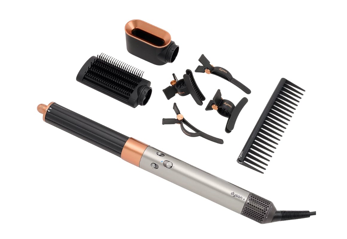 This set includes an Airwrap Origin Multi-Styler, a 1.2-inch barrel, a Coanda smoothing dryer, a round volumizing brush, a detangling comb, and four styling clips