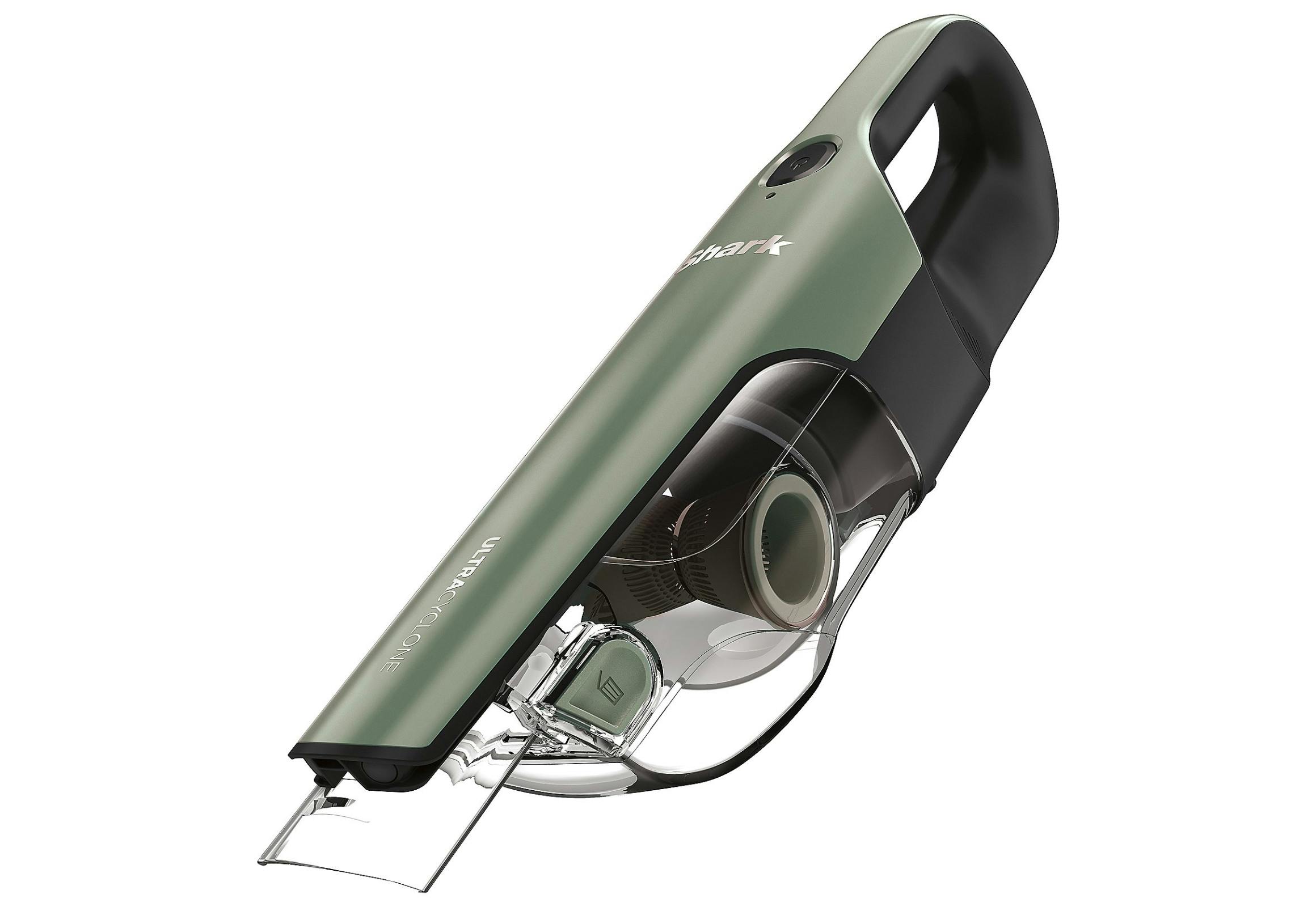 The vacuum includes a crevice tool, a scrubbing brush, and a charging adapter. It has a dirt ejector and an extra-large dust cup. The filter is washable.