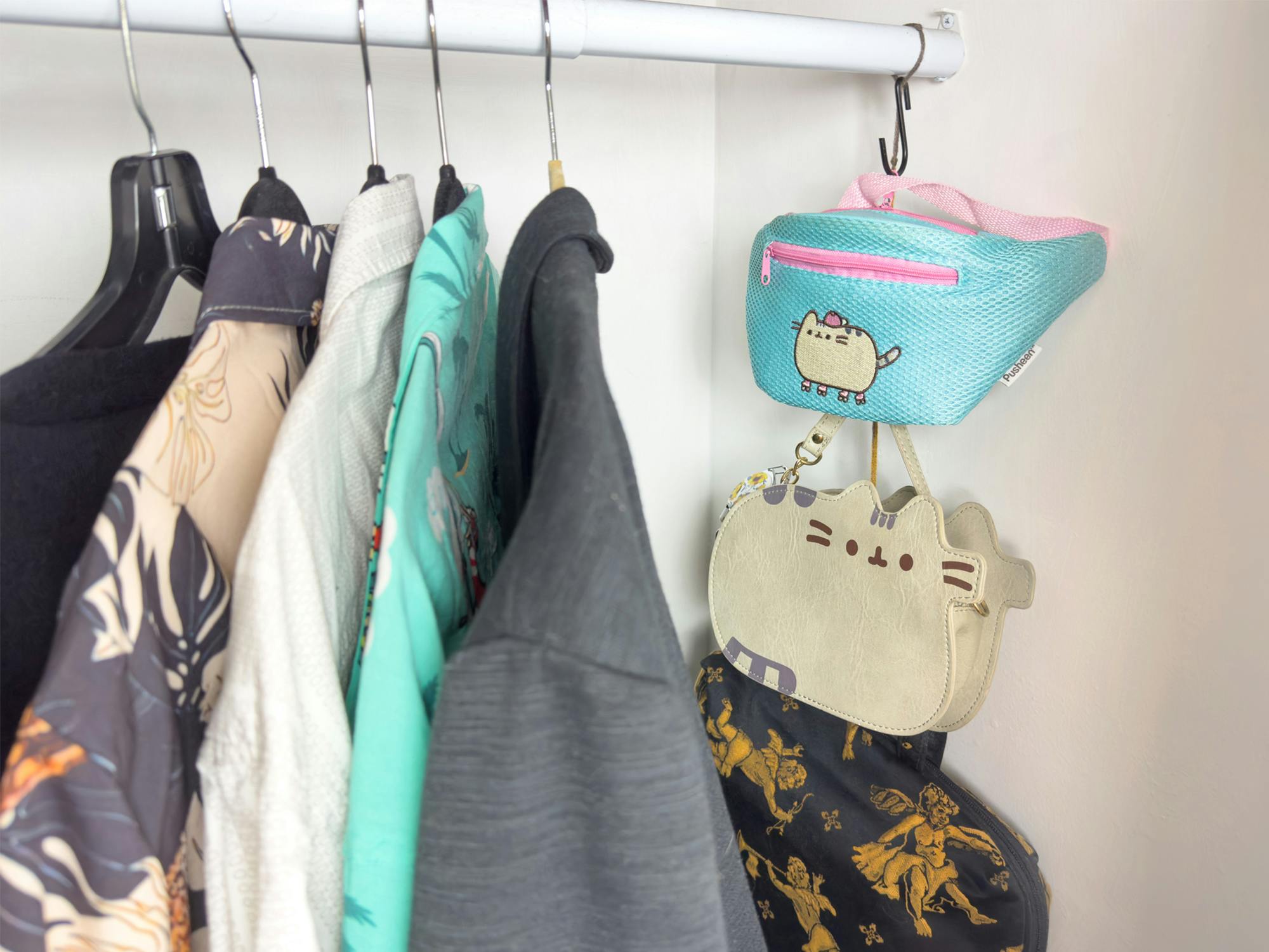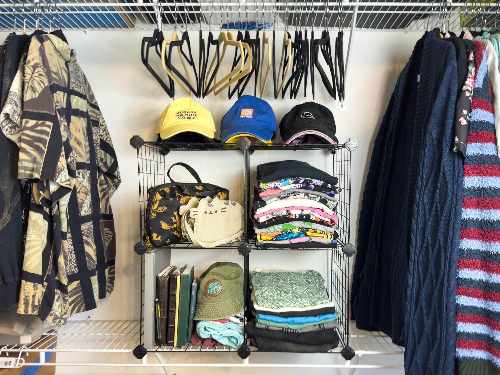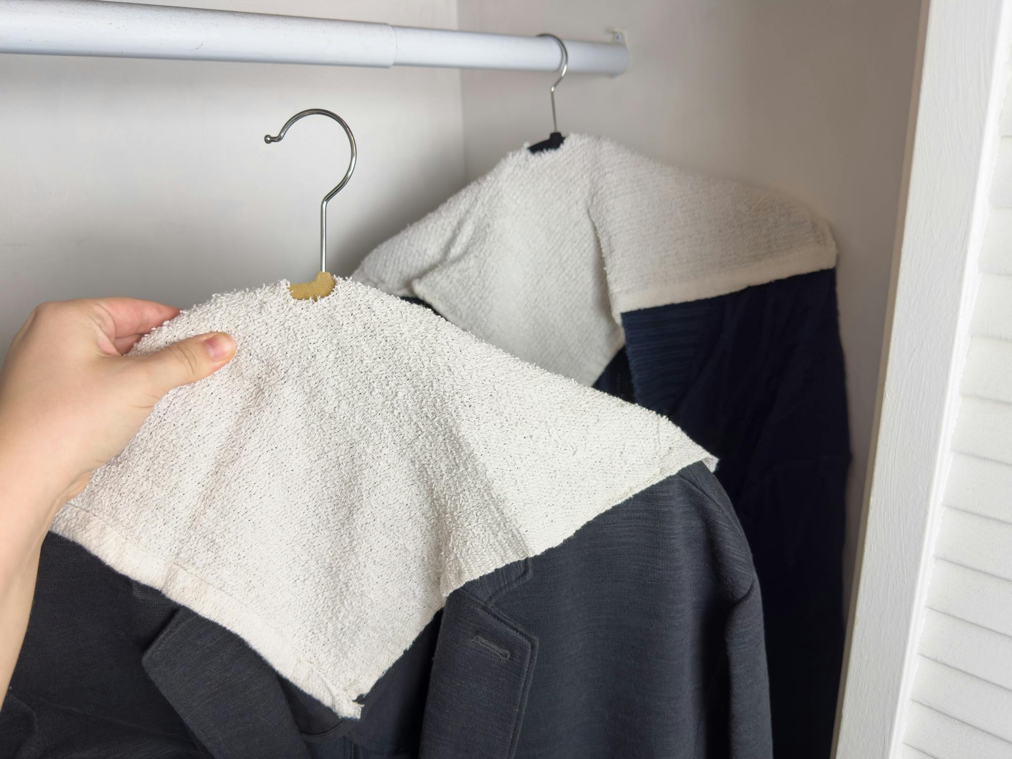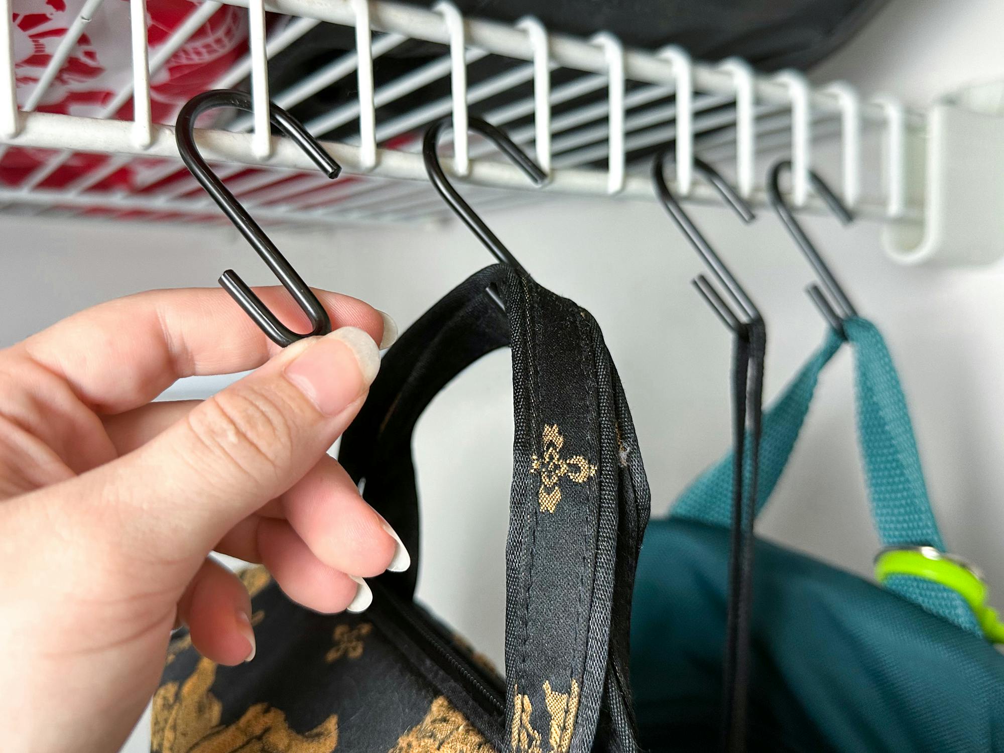 One huge threat to home organization is clothes that constantly slip off hangers. One closet organization idea is to use a hot glue gun to add a bit of “stick” to the tops of your hangers. This works best if you have wooden or plastic hangers.