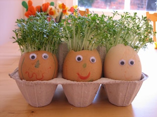 What kid doesn’t want to watch something grow in an egg? Decorated eggshells like these are the perfect vessels to raise quick-sprouting watercress.