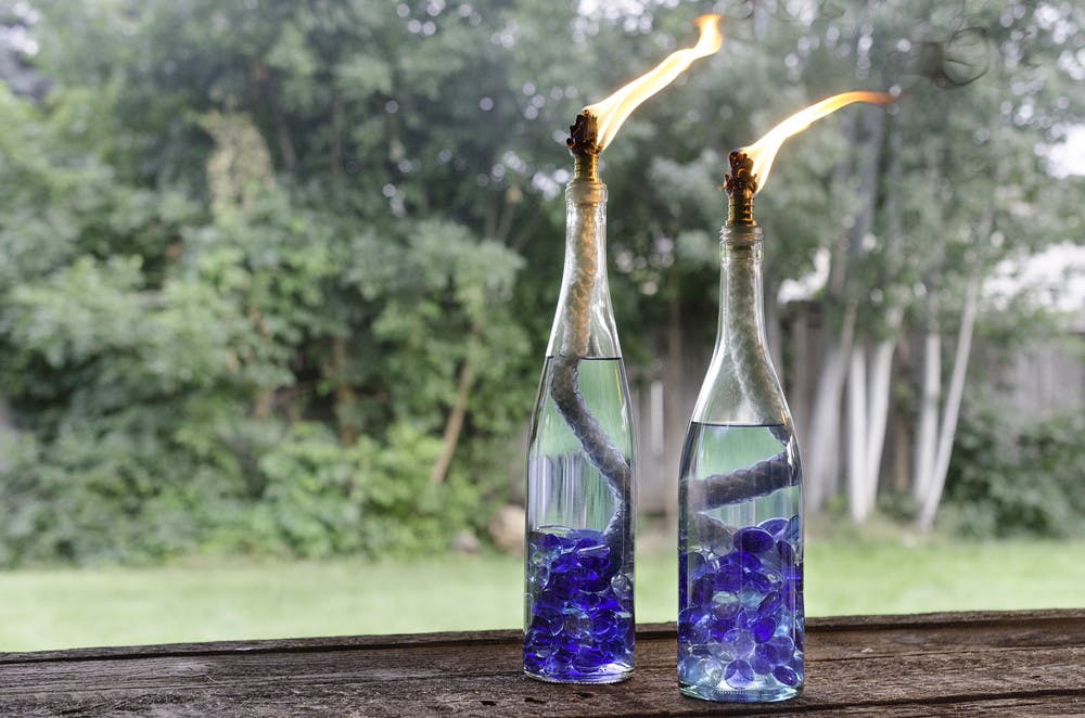 3. Fill your bottle with tiki torch fuel, insert your wick, and light!
