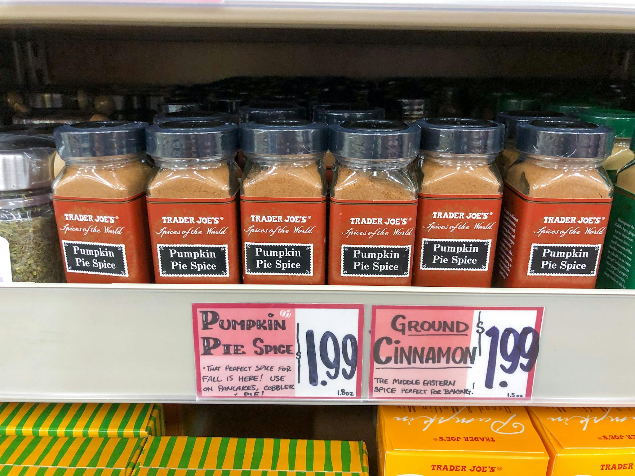 You’ll actually get a better deal if you shop for pumpkin pie spice at Walmart instead, where you’ll pay $1.12 per ounce — instead of Trader Joe’s $1.66 per ounce.