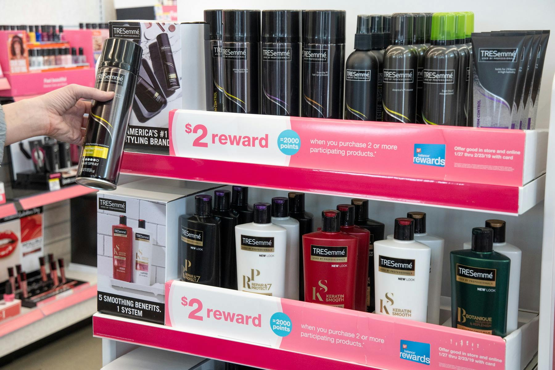 tresemme shampoo, walgreens razors, and scope mouthwash in a cart