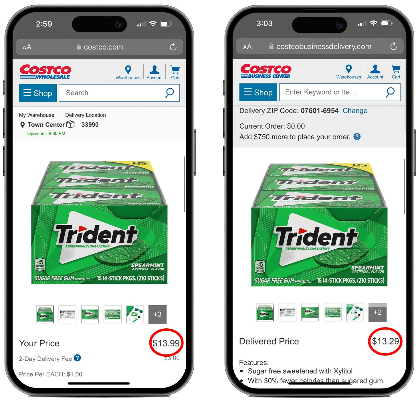 However, I found that online prices for the same items are sometimes cheaper through Costco Business Center than they are from the regular Costco.com. For example, I found this 15-Pack of Trident Sugar-Free Gum for $13.99 on Costco.com. The same item (in the same size) sells for $13.29 on CostcoBusinessDelivery.com.