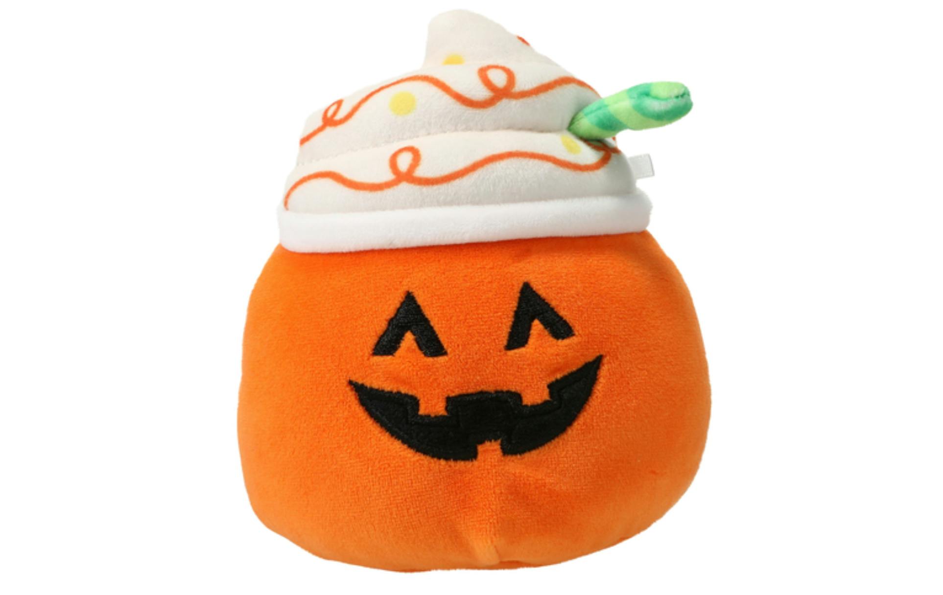 a person holding a squishmellow pumpkin in front of a five below cart