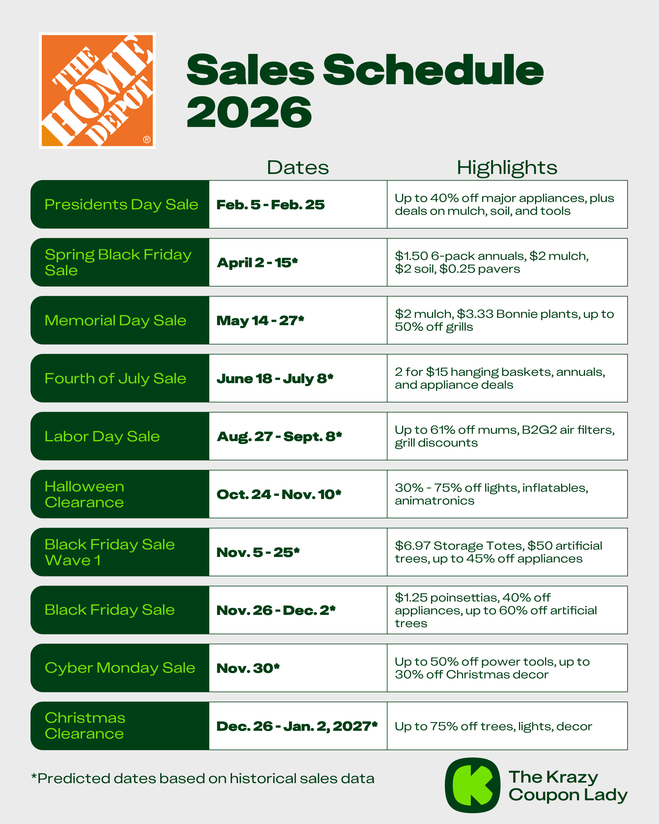 Our team at The Krazy Coupon Lady keeps a close eye on the Home Depot sale schedule every year. Whether you're focused on Home Depot plant sales or just want the lowest prices on Home Depot Christmas decor, use our research to find out when to shop.