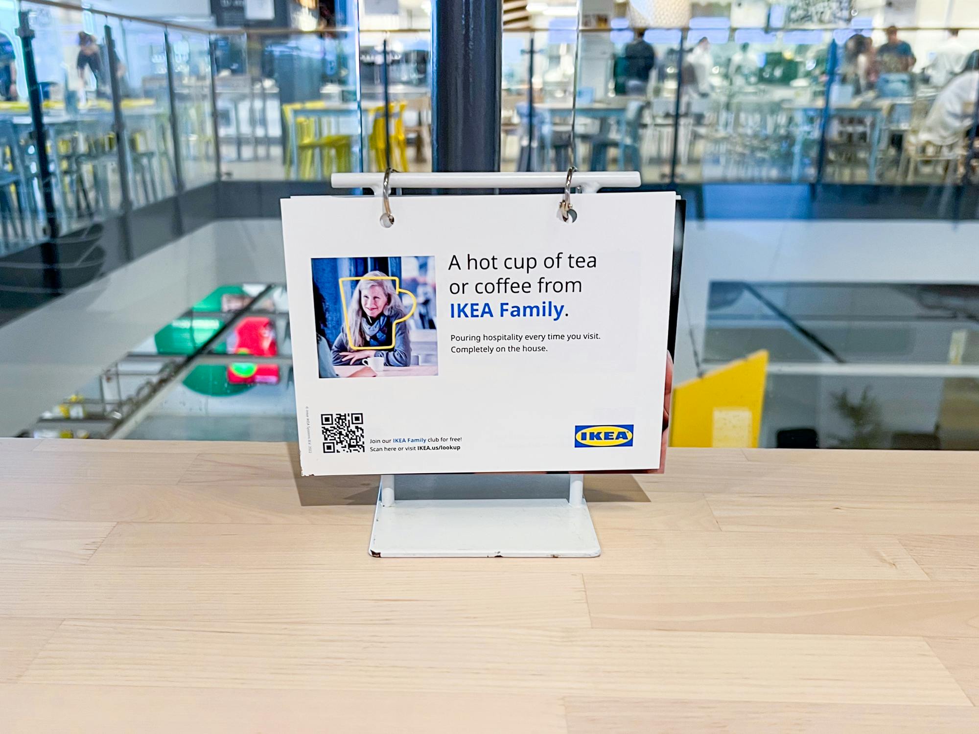 Ikea Family members can get a free cup of coffee or tea in the restaurant Monday - Friday. Just grab a mug and present your card to the cashier at checkout — no purchase necessary.